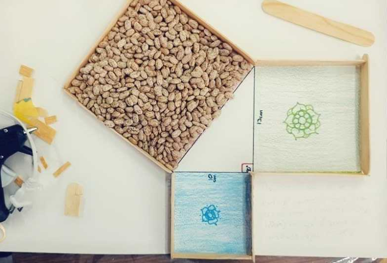 Nuestros alumnos en compañía de sus profesores, demostraron a través de las áreas que: la suma del área verde más el área azul es igual al área de la región que contiene semillas. Con esto nuestros alumnos lograron deducir el teorema de Pitágoras «c² = a²+b²».